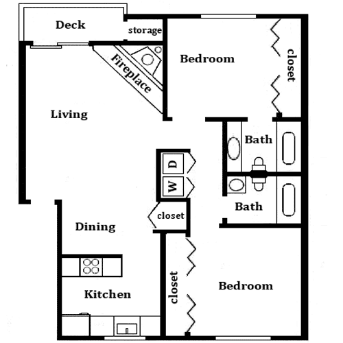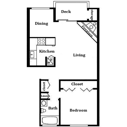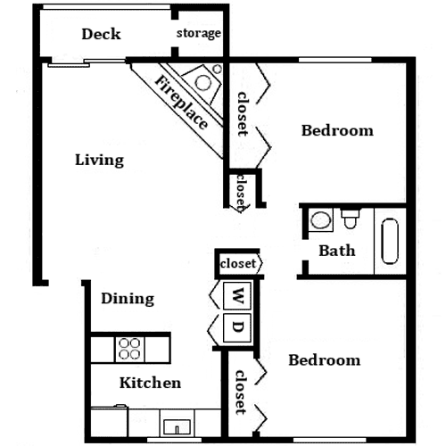 foot two bedroom and one bathroom apartment. This apartment features a large fireplace in the living room, a large deck area overlooking the woods and a